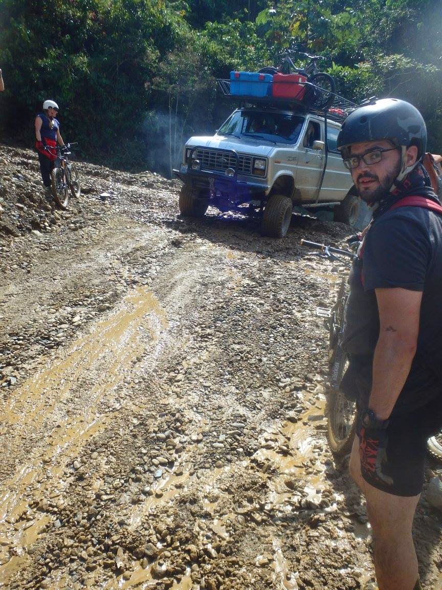 | A short-lived team-building exercise to help the jeep gain some traction... after helping one another get bikes across the rainwater river. |